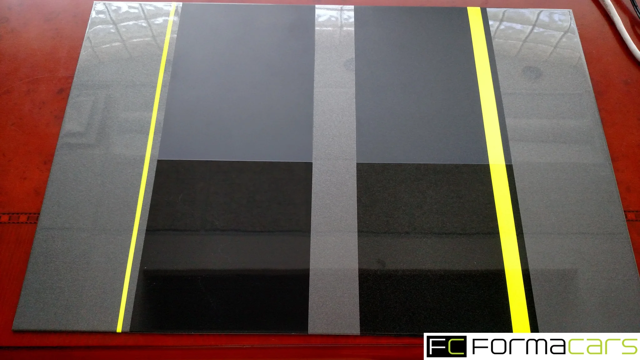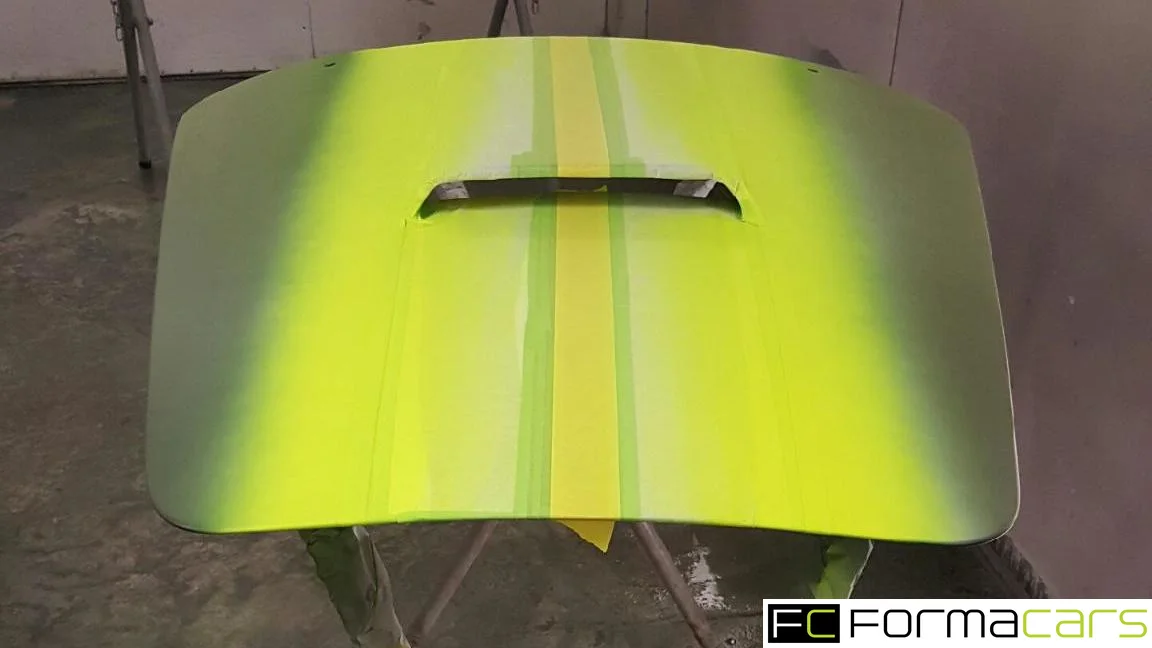 A few weeks ago we had our body man paint a test panel. We had decided on a medium gray metallic base with black stripes outlined by our signature neon yellow/green. We wanted to play with the black - metallic or not, matte or gloss - as well as wide or narrow neon.